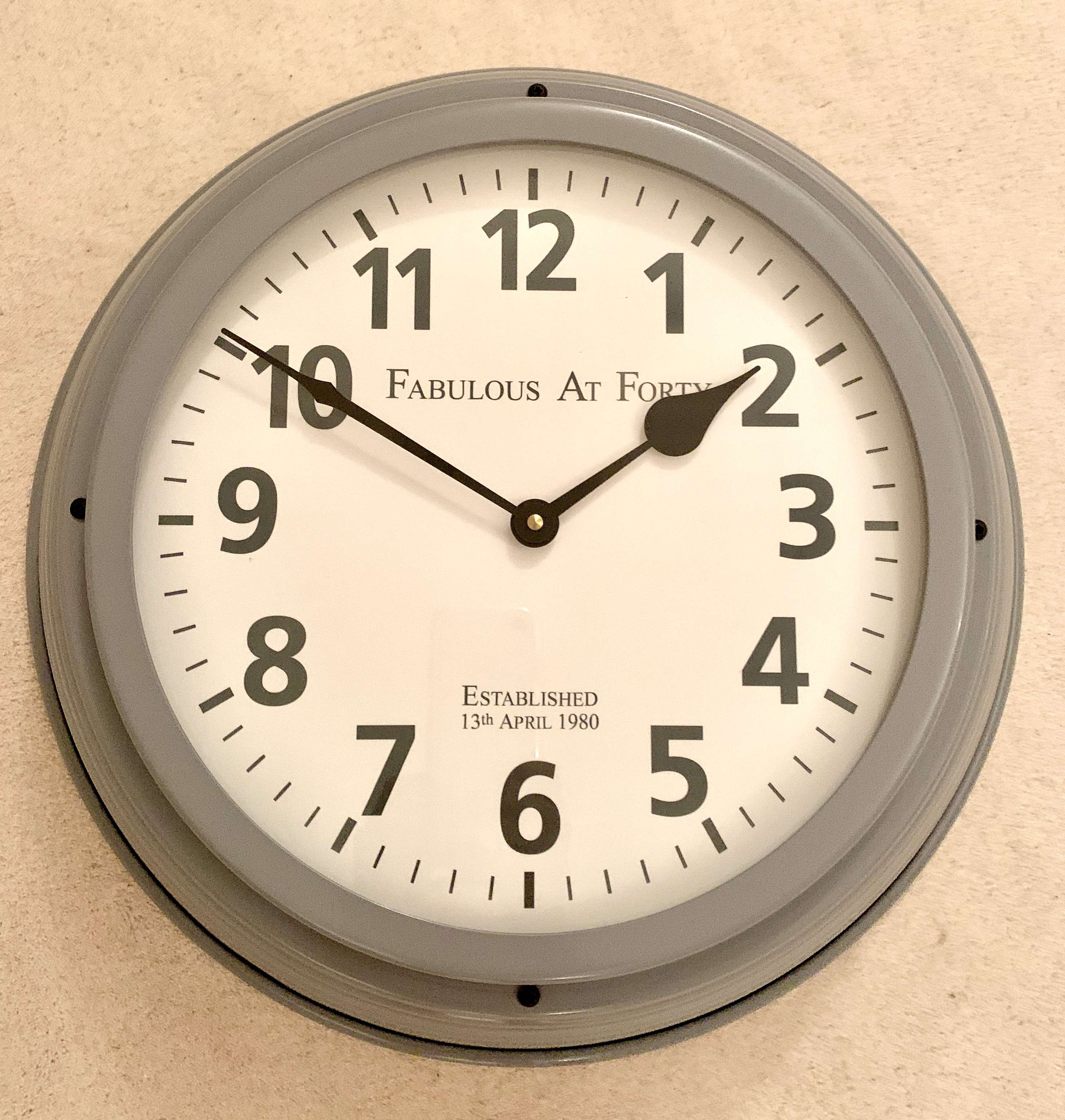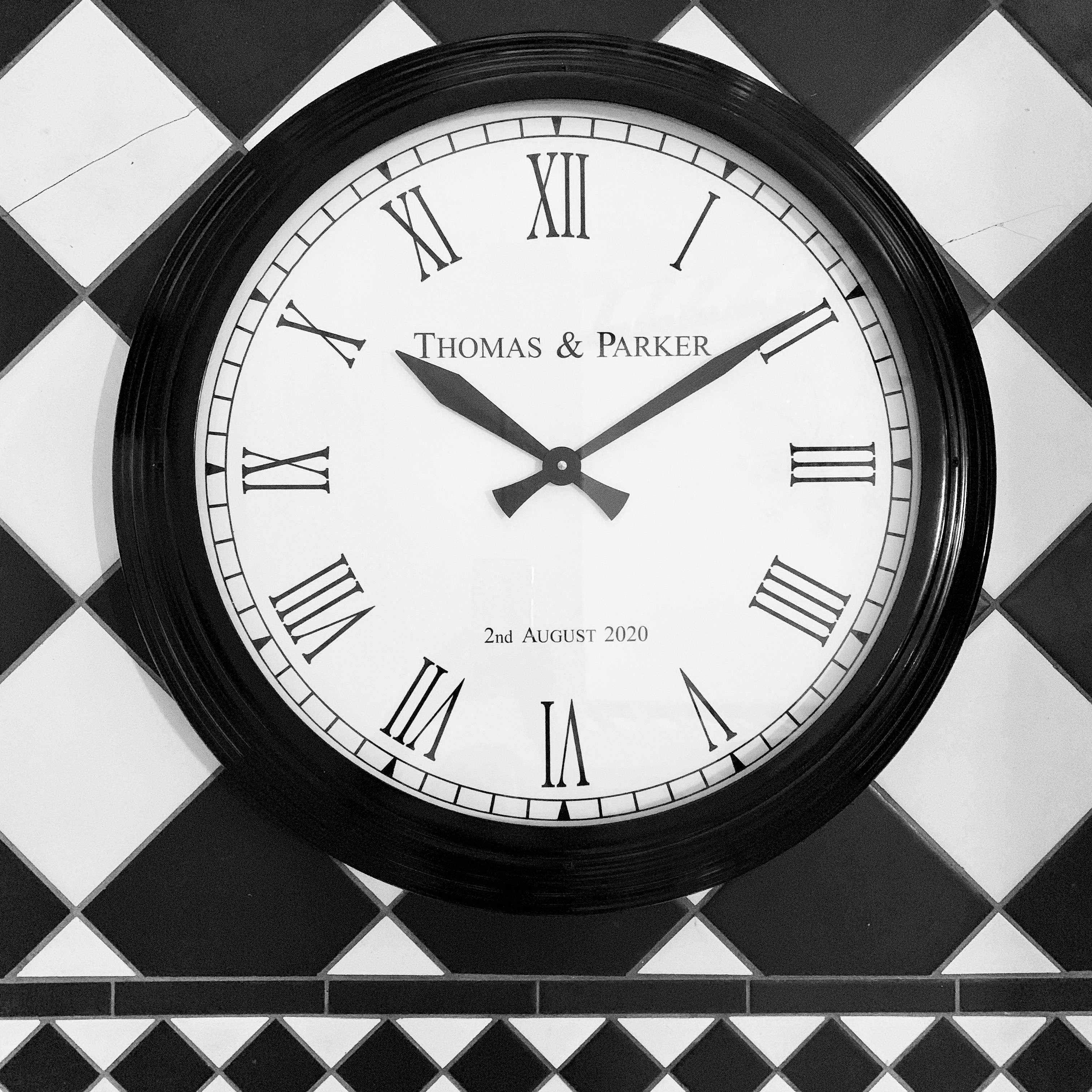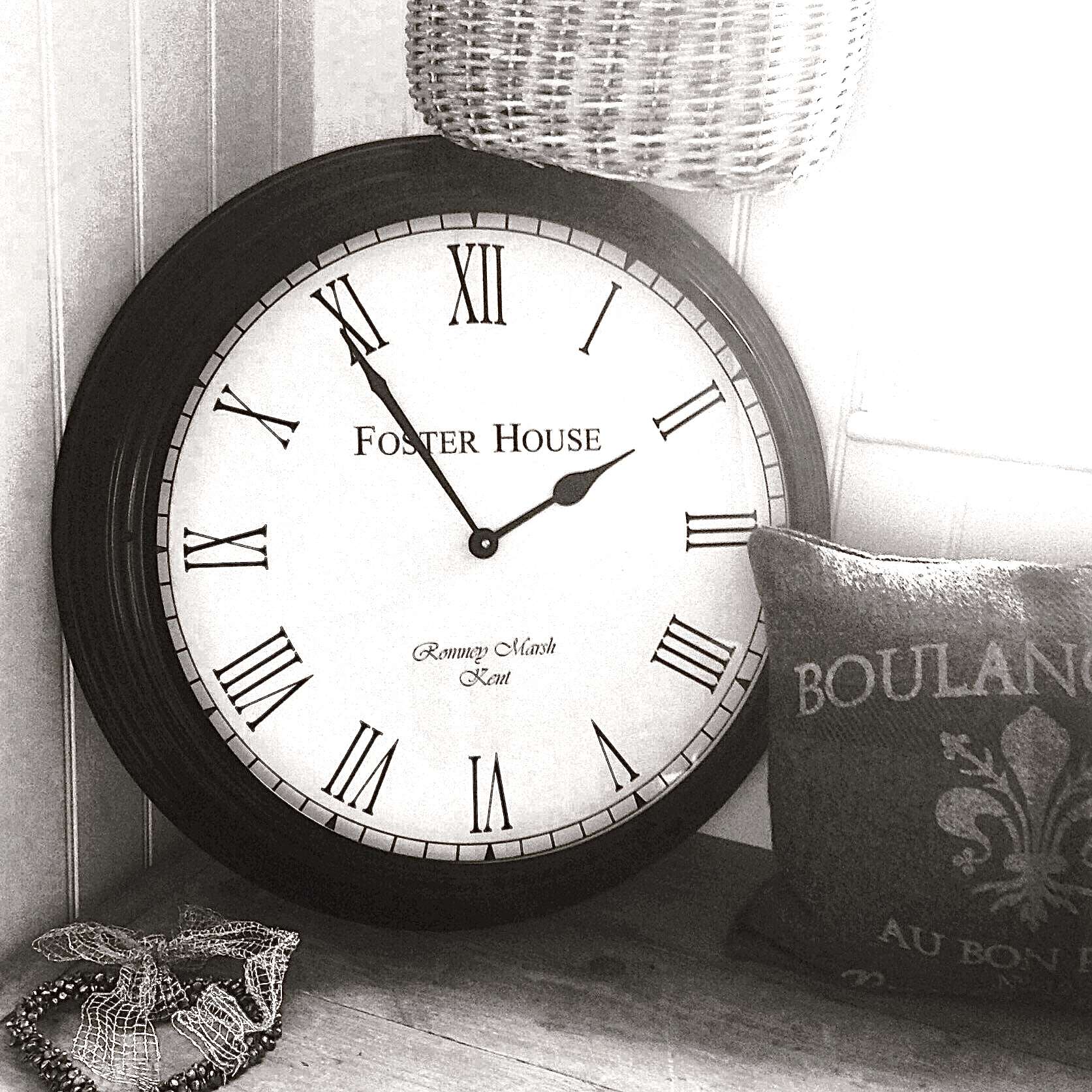 This Black medium Clock with white dial has been personalised with Our customers House Name