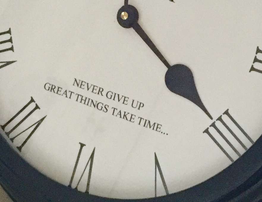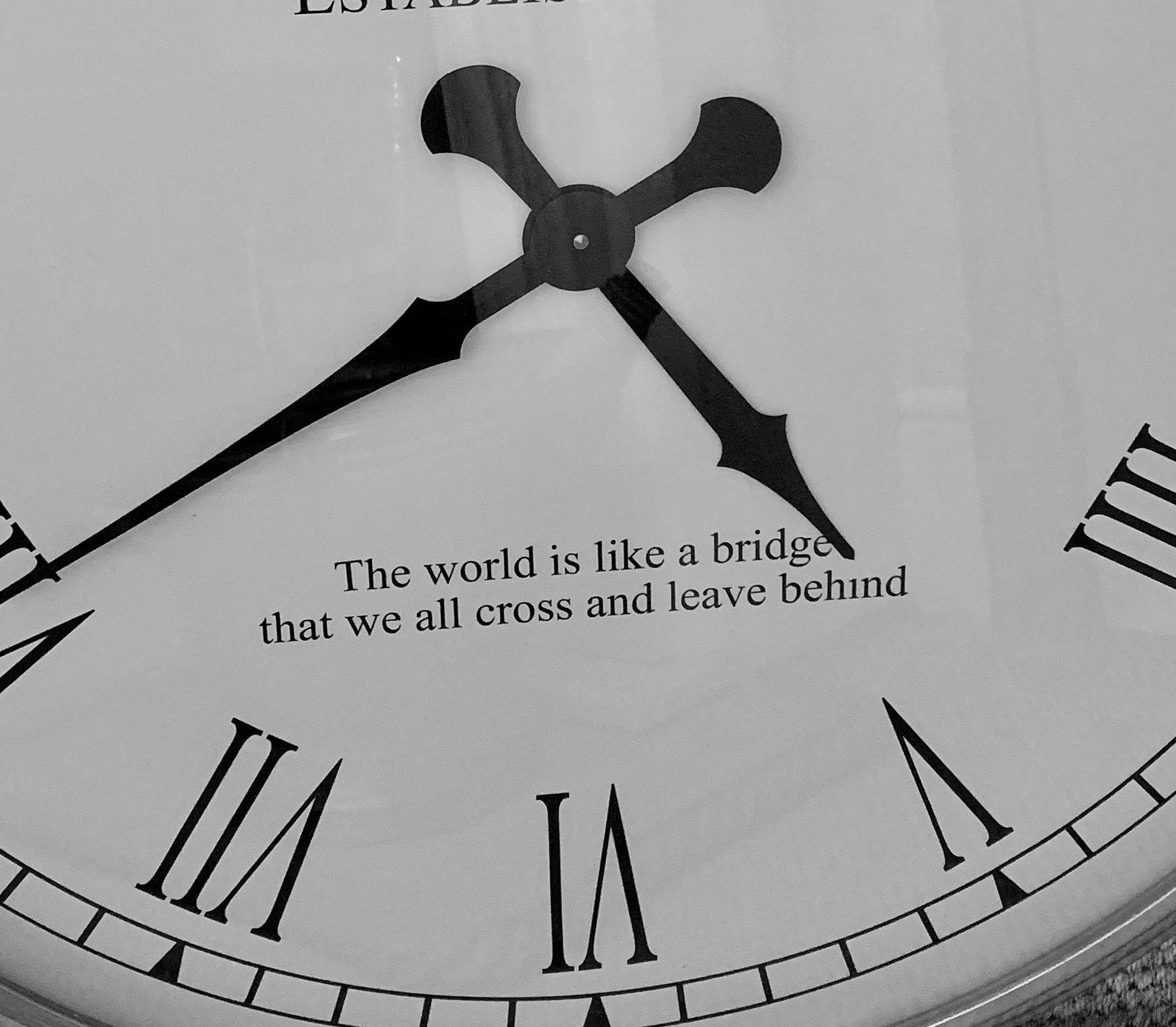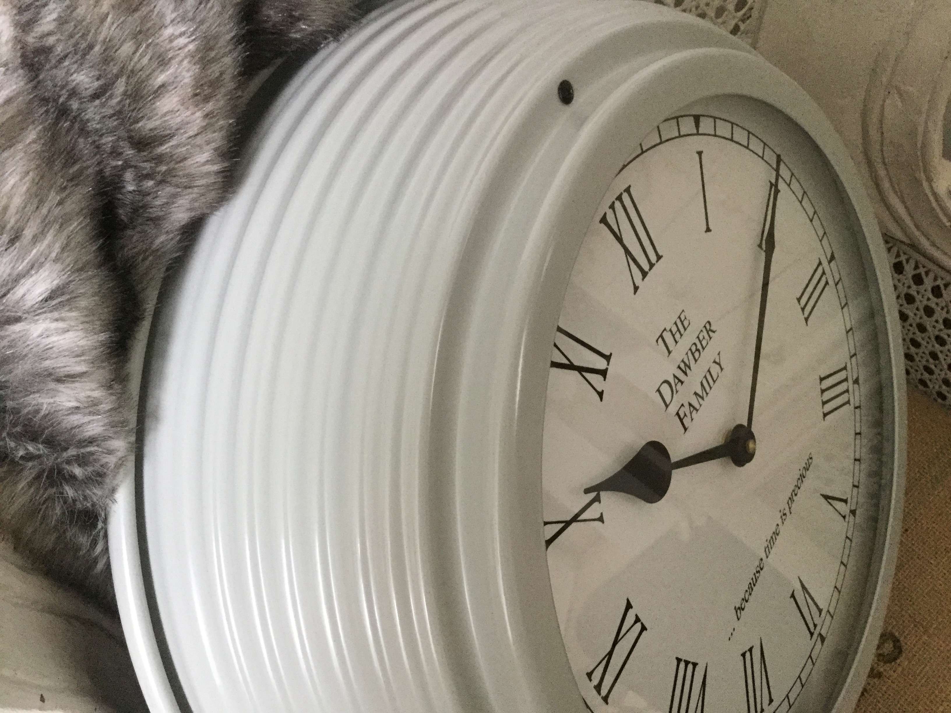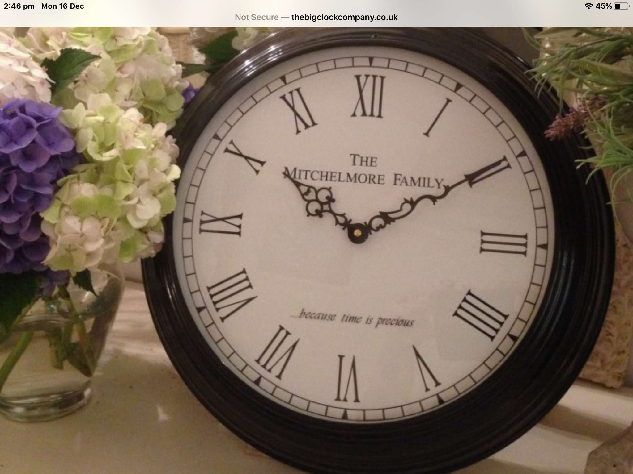 Small Black clock with white dial and personalised with family name and lovely message on the bottom half of the dial “because time is precious “