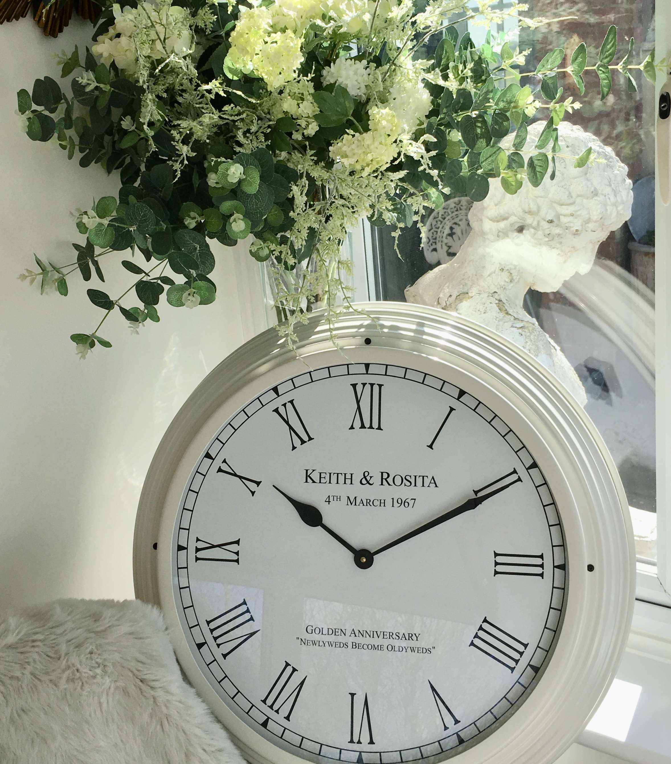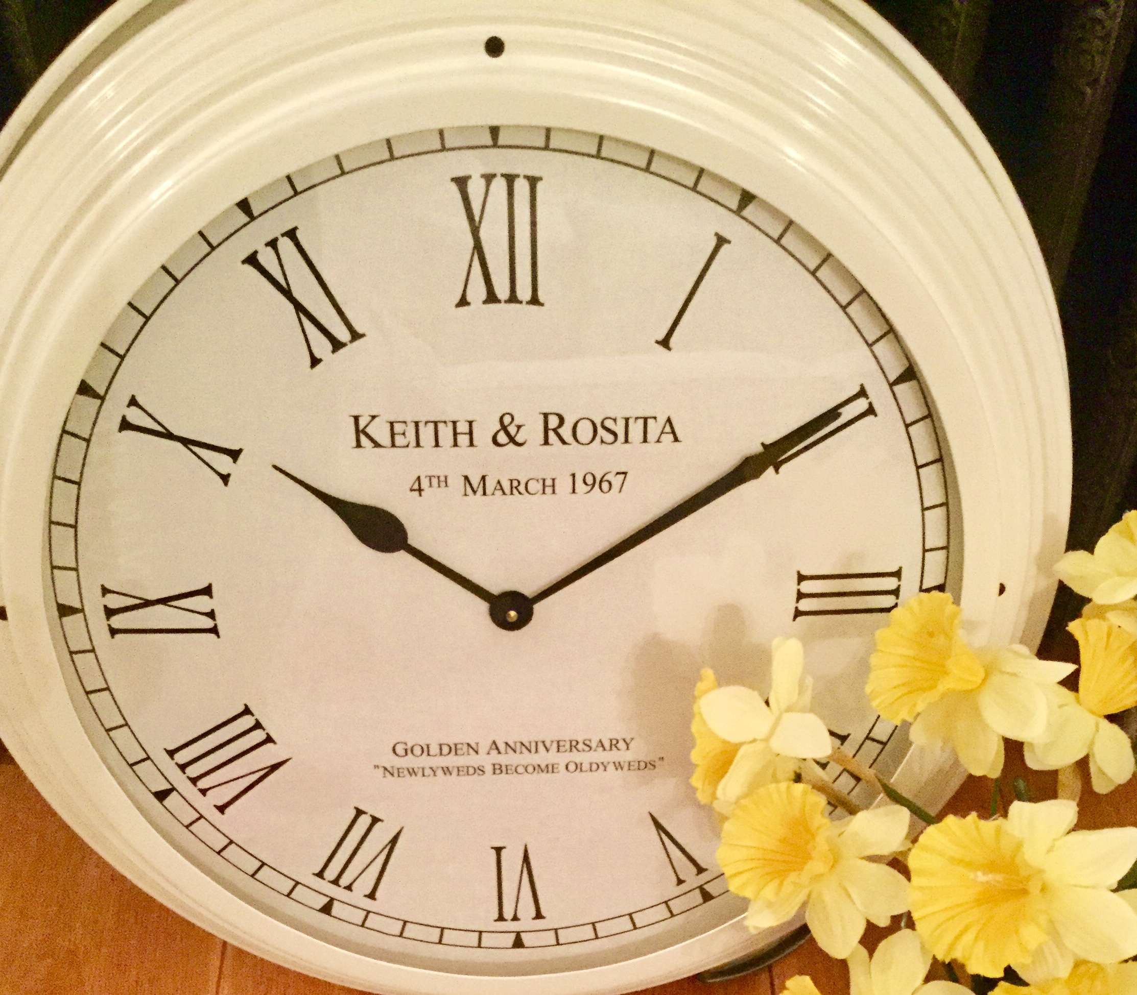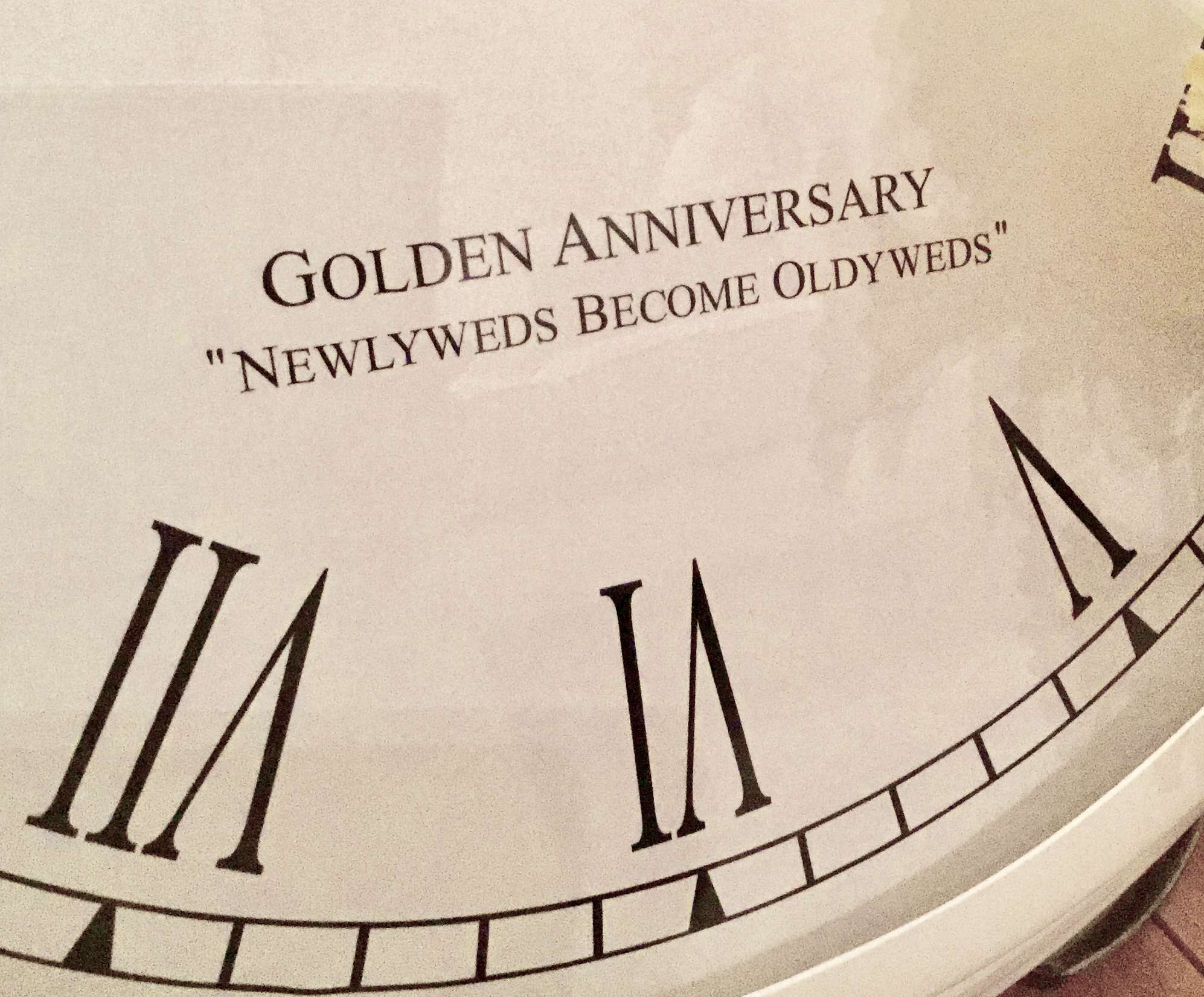This pale cream clock was made to celebrate a Golden Anniversary with amusing message “NEWLY WEDS BECOME OLDY WEDS”