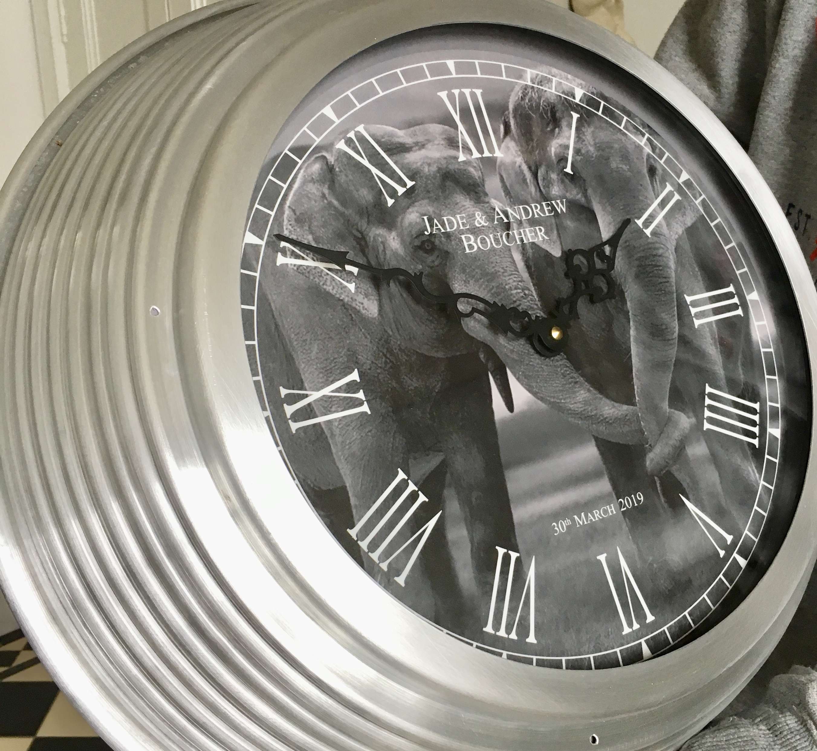 This clock was made as a WEDDING GIFT the couple had a love of elephants and we found a suitable image of a pair of elephants printed their names and wedding date to make a really bespoke gift